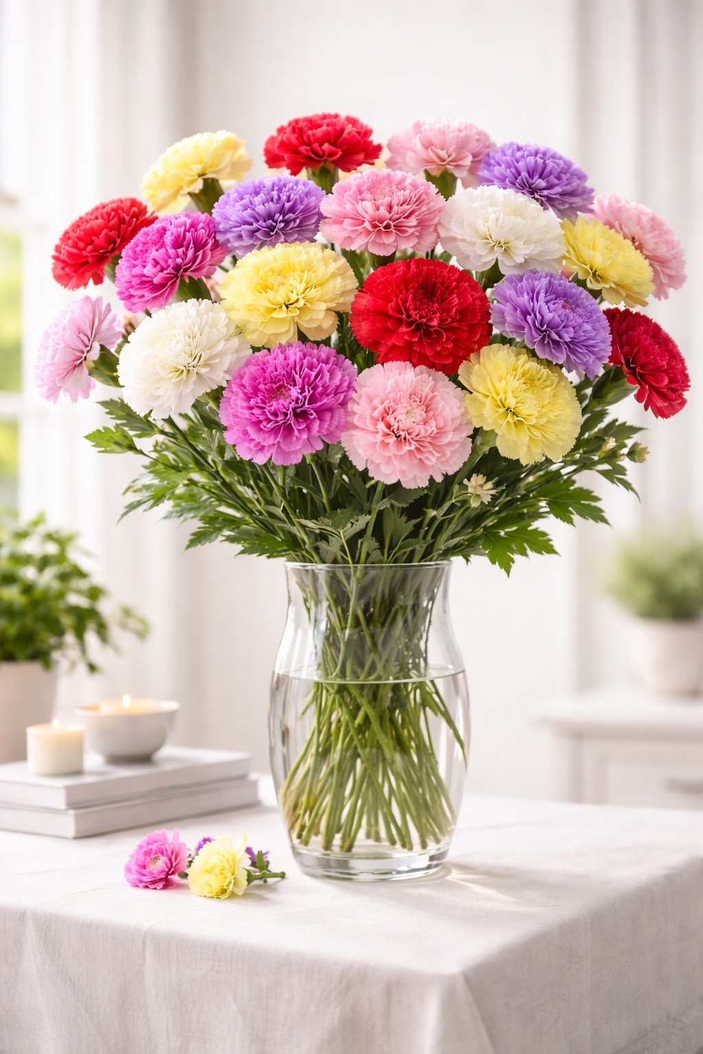 hey develop from compact, branching plants, producing long, slender stems topped with richly layered blooms. Carnations perform best in full sun to bright partial light, in well-drained, slightly alkaline soil, with regular watering that keeps the roots evenly moist without becoming waterlogged. In enclosed environments such as indoors or greenhouses, they show optimal performance under bright but indirect light, cool to moderate temperatures. (approximately 55–70°F / 13–21°C), good air circulation, and consistently moist soil. These conditions help maintain strong, resilient stems and ensure their delicately fringed flowers remain fresh and vibrant for an extended period.